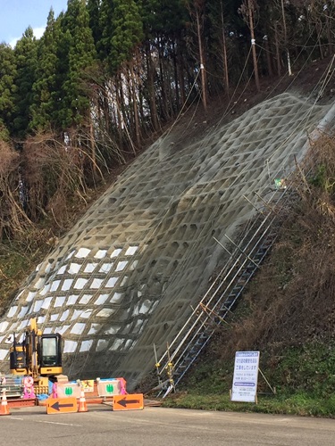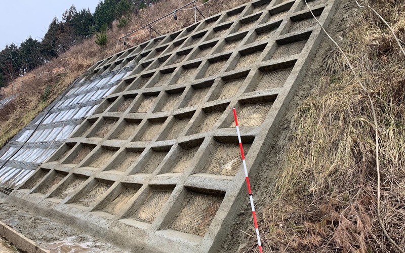 自然災害や地形の崩壊を防ぐため、法面の整備・補強工事を実施。地域の安全と安心を守る重要な土木技術です。